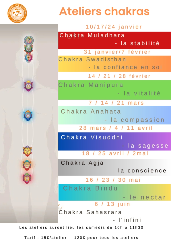 Nous lancerons un cycle d'ateliers visant à approfondir la compréhension des effets des techniques de yoga par l'étude des chacras, ces centres énergétiques cachés de l'être humain.